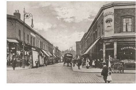 a busy street lined with shops (shown in the photograph on the road In about 1910).