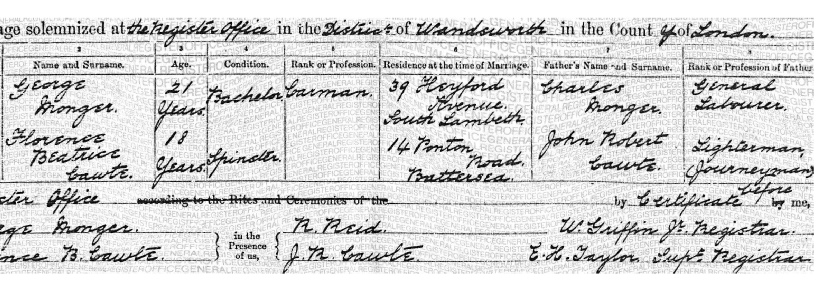 Office in Wandsworth, witnessed by R Reid and Florence’s father, John. Florence was