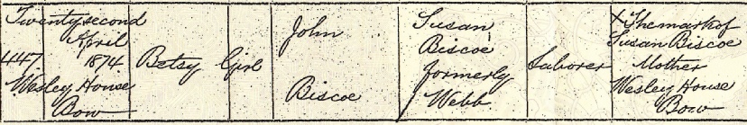 the daughter of John Biscoe, a labourer from Bromley-by-Bow, and Susan Webb, who