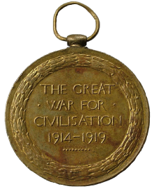 On 15 May 1917, Edwin was transferred to the 39th Company, a labour corps. It was with this Company, stationed for sometime in Shoreham by Sea that he saw out the war. Not long before Armistice Day, in September 1918, he went absent for two days, forfeiting two days’ pay. He was finally demobbed at Crystal Palace in January 1919, although he continued to be a reserve on mobilisation. In 1920, like all soldiers who had served overseas during the war, he was awarded a Victory Medal (an example is shown on the left).