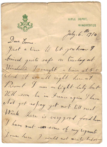 Just a line to let you know I arrived quite safe on Tuesday at Winchester I caught a train at 5 o’clock. It is all right here at present. I am on light duty but will soon be in France again. I have not got no pay yet, not till next week. There is very good food here. I have met some of my regiment down here. I could not rite before. Is all at present. Give my love to the children and this is my best love for you from your loving husband, E Bostock. xxxxxxxxx