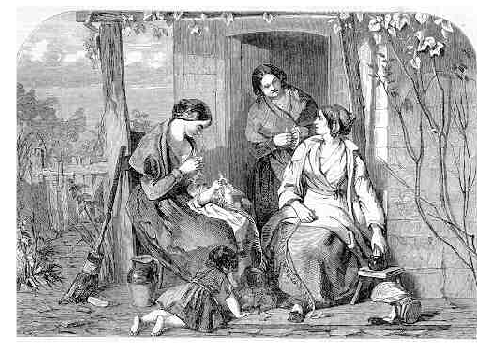 “Walk along the main thoroughfare from the parish church towards the city, peep on one side of the hay-bundle standing at the corn-chandler's door; look through the group of rough, idle loungers, leaning against the corner of the gin-shop, or dive under the fluttering garments that hang across outside the cheap clothier's window, and you will see a dark, damp opening in the wall, like the channel of a sewer passing under and between the houses, and leading to one of the wretched courts and alleys. You enter the passage, picking your way to the bottom, and find a little square of low, black houses, that look as they were built as a penal settlement for dwarfs. The roofs are depressed, the doors are narrow, the windows are pinched up, and the whole square can almost be touched on each side by a full-grown man. At the further end you will observe a tap, enclosed in a wooden frame, that supplies the water for the whole court, with a dust-bin and privy, which are openly used by all…Glancing over the tattered green curtain at one of the black windows, you will see a room like a gloomy well…In some cases these courts are choked up with every variety of filth; their approaches wind round by the worst kind of slaughter-houses; they lie in the midst of rank stables and offensive trades; they are crowded with pigs, with fowls, and with dogs; they are strewn with oyster-shells and fish refuse; they look upon foul yards and soaking heaps of stale vegetable refuse; their drainage lies in pools wherever it may be thrown; the rooms of their wretched dwellings have not been repaired or whitewashed for years; … and they are often smothered with smoke, which beats down upon them from some neighbouring factory, whose chimney is beyond the control of the Act of Parliament… New Inn Yard, Shoreditch, is another of the worst; and the whole line of Holywell Lane, on either side, is full of these holes and corners.”