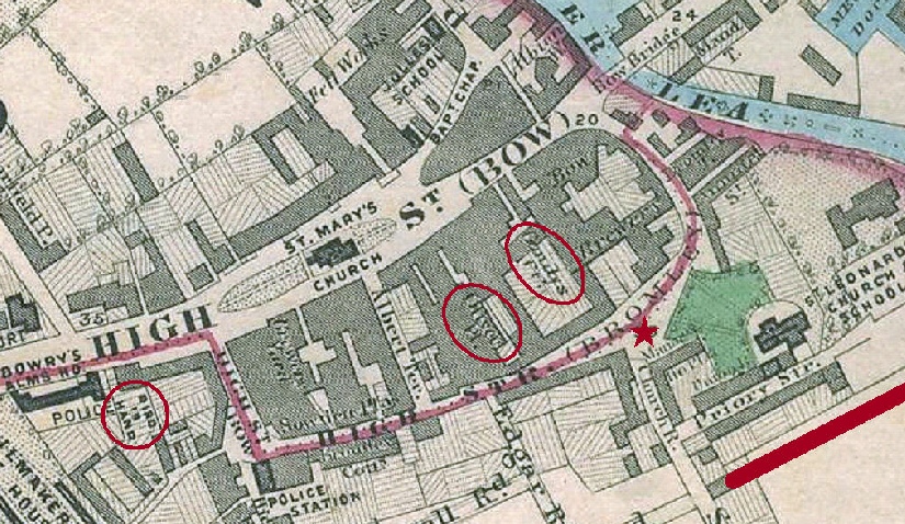 Bethnal Green was one of the poorest parishes in London. The map on the right, dating to 1862, shows the density of Bethnal compared to Bromley-by-Bow, and not long after their marriage, John returned to the familiar turf of Bow. Gandy Court was located on the south side of the High Street and backed onto Oliver Court where John’s family was living. Susan Webb, who was now calling herself Susan Catley was living nearby with Charles Catley at 66 High Street (where her mother had died in 1878).