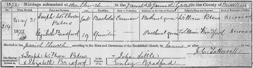 Church of St James the Great in Bethnal Green. The marriage entry records that he