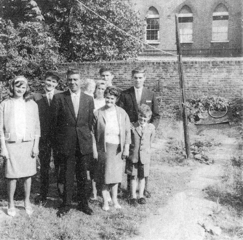 The Moss family circa 1960 at South Birkbeck Road, Leytonstone. Front row: Mary, William (senior), May, John. Back row: Dennis, Stephen,Iris, George, Bill
