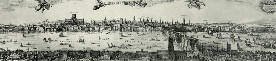 A panorama of London in 1616 showing the city stretching along the north and south banks of the River Thames with London Bridge linking the two